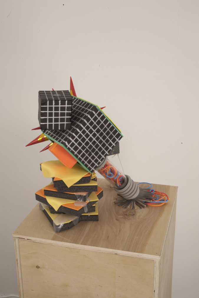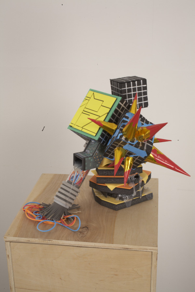 foam, foamcore, chipboard, glue, paper collage, paint marker and spray paint, 16 x 16 x 16 inches, 2012